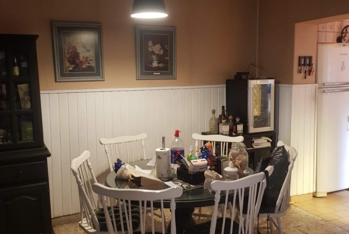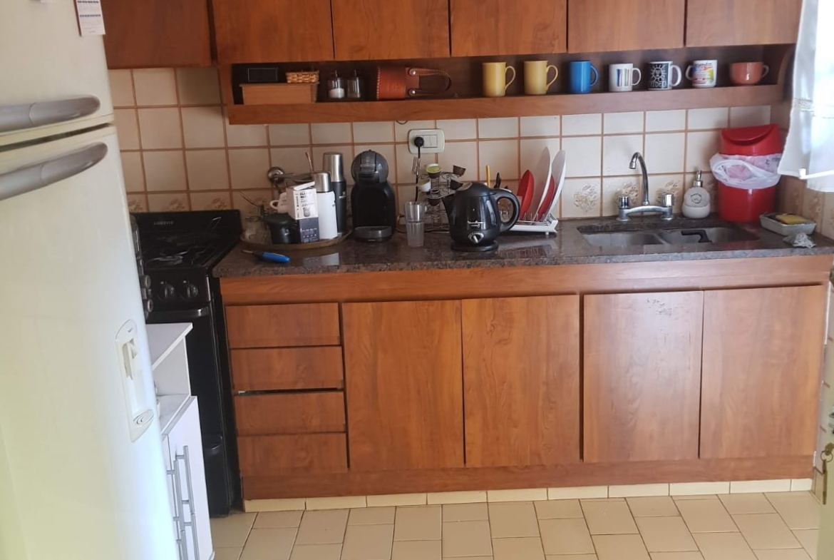 Cuenta con 3 dormitorios con pisos de parqué, ( dos de los dormitorios con placar empotrado) , y el tercer dormitorio se puede usar como vestidor, 2 baños, uno completo, la cocina tiene muebles sobre y bajo mesada de madera, comedor integrado a la cocina y un living amplio con estufa hogar.
