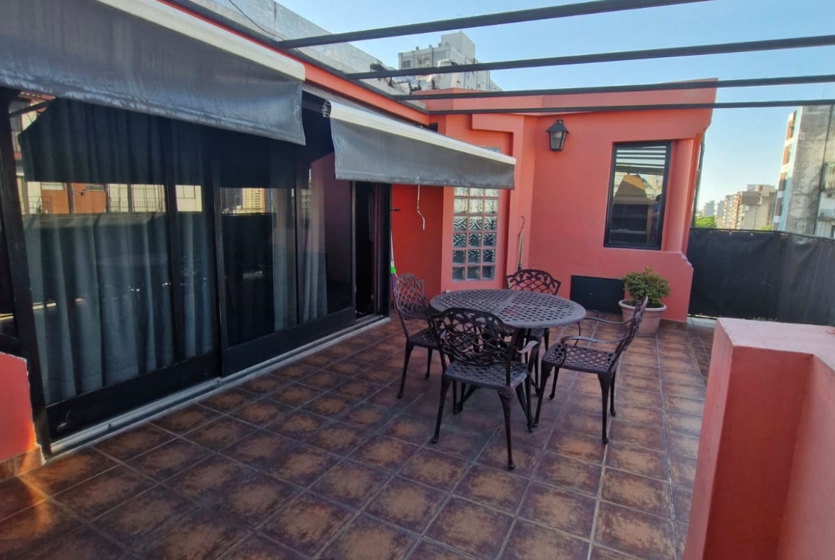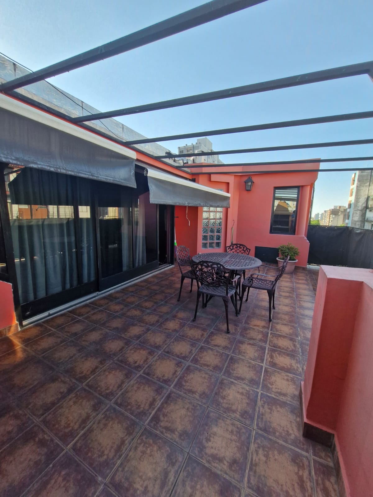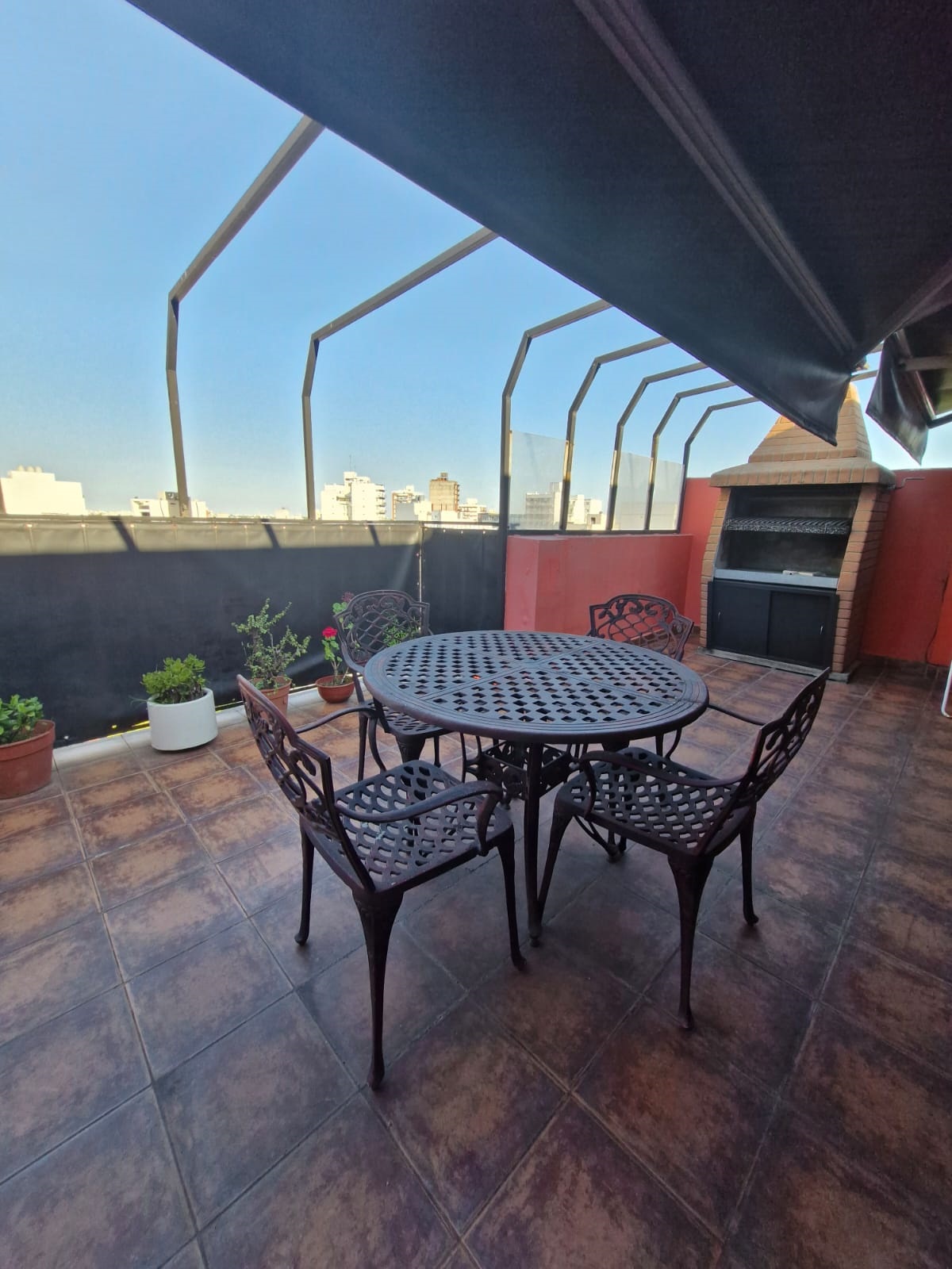 Balcón terraza propia con parrilla y toldo.